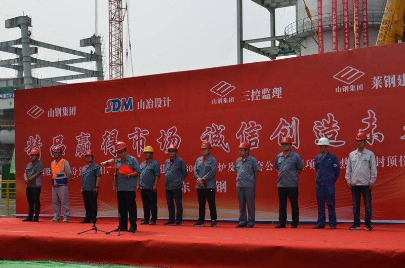 2020年6月28日9点50分,公司总包的山钢股份莱芜分公司新旧动能转换项目1号3800m3高炉热风炉顺利封顶!山钢股份莱芜分公司新旧动能转换项目工程指挥部副指挥孙建设,山钢股份莱芜分公司炼铁厂经理、高炉工程项目经理部经理张明,新旧动能转换项目工程指挥部高炉工程项目经理部常务副经理贾友剑,莱芜三控冶金建设监理事务所经理沈桂联,我公司党委书记、副总经理谷卓奇,莱芜钢铁集团建筑安装工程有限公司党委书记、董事长时元海,莱芜钢铁集团建筑安装工程有限公司副经理梁博,上海二十冶莱钢高炉项目部项目经理李虎,中国十九冶莱钢高炉公辅项目部项目副经理田泽龙,河北省安莱钢高炉喷煤及铸铁机项目部项目经理王红帅,中十冶莱钢主控楼项目部项目经理马少华出席了仪式。